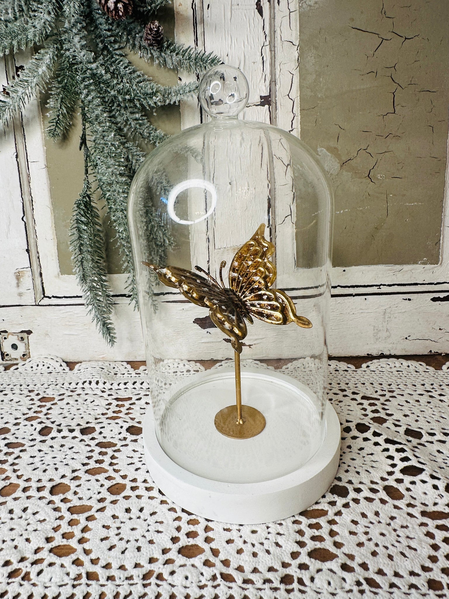GOLDEN BUTTERFLY ON STAND IN VINTAGE CLOCHE