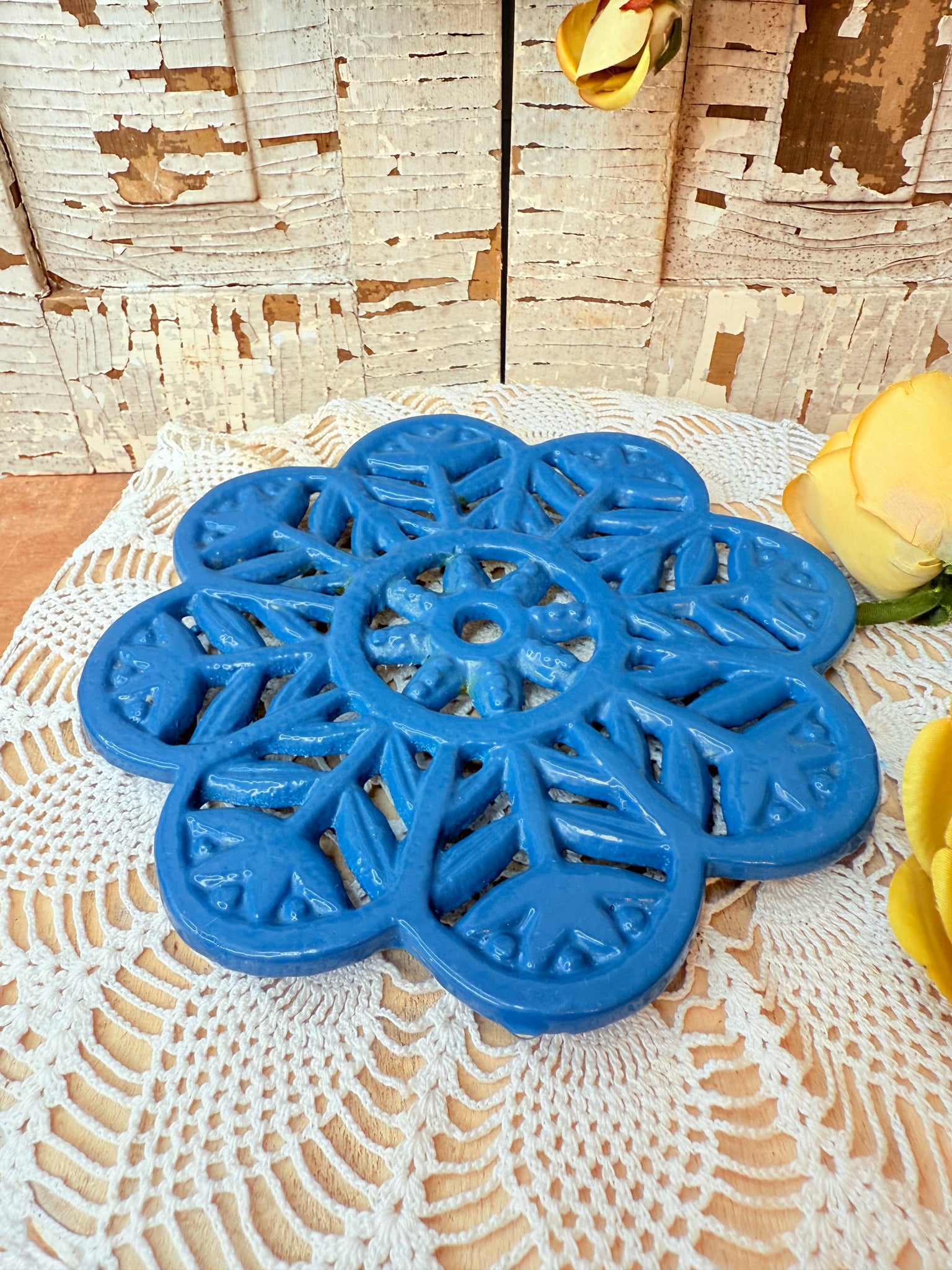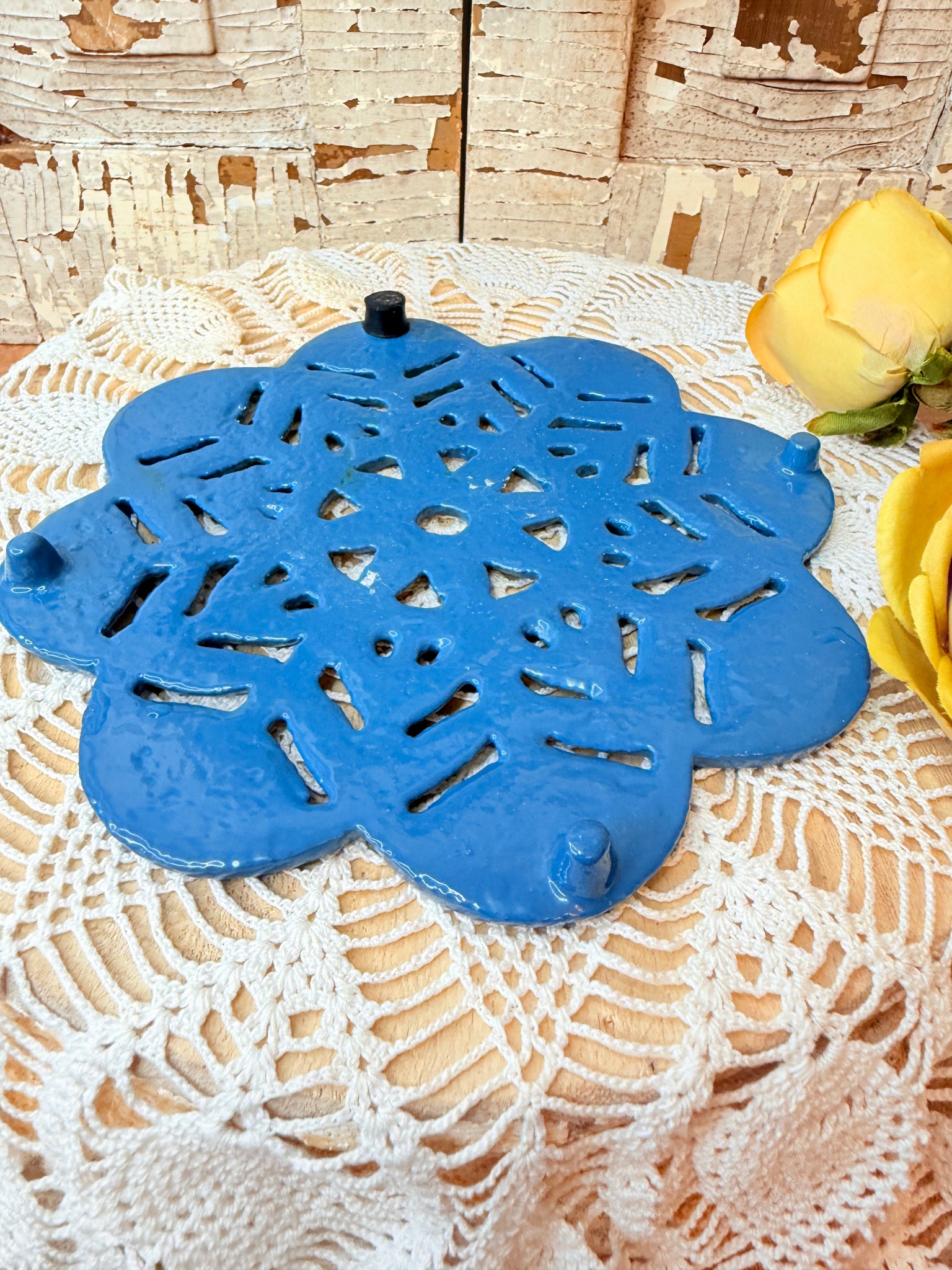 VINTAGE BLUE ORNATE CAST IRON TRIVET