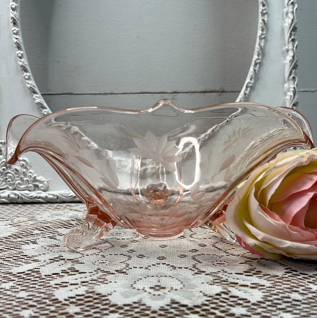 PINK DEPRESSION ETCHED FLORAL BASKET ON FEET