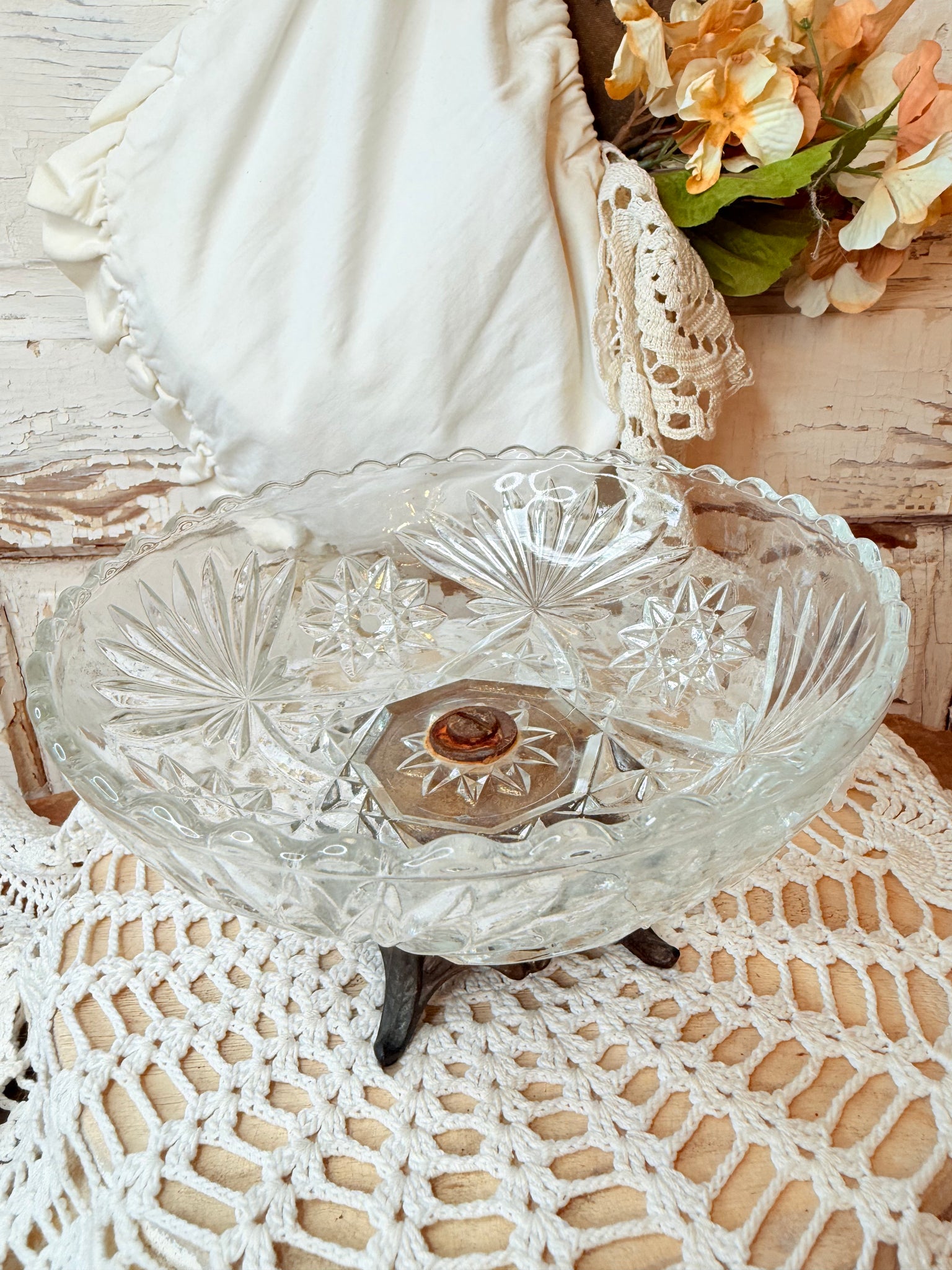 VINTAGE GLASS ORNATE BOWL ON COPPER DETAILED STAND
