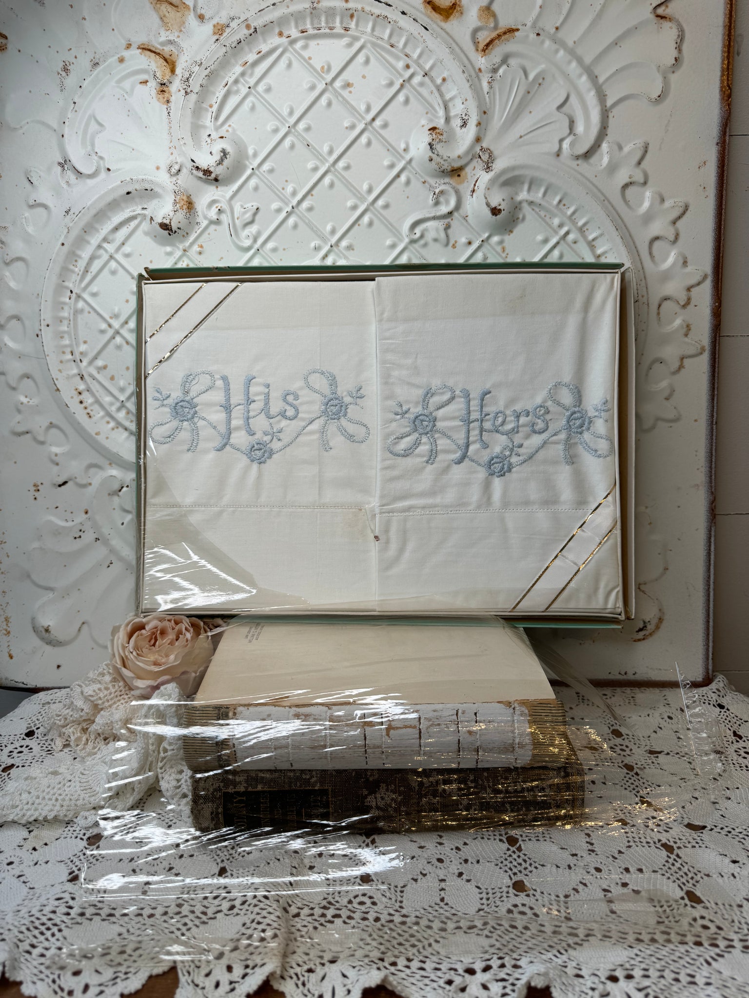 HIS AND HERS BLUE BOW EMBROIDERED PILLOWCASES IN ORIGINAL VINTAGE PACKAGING