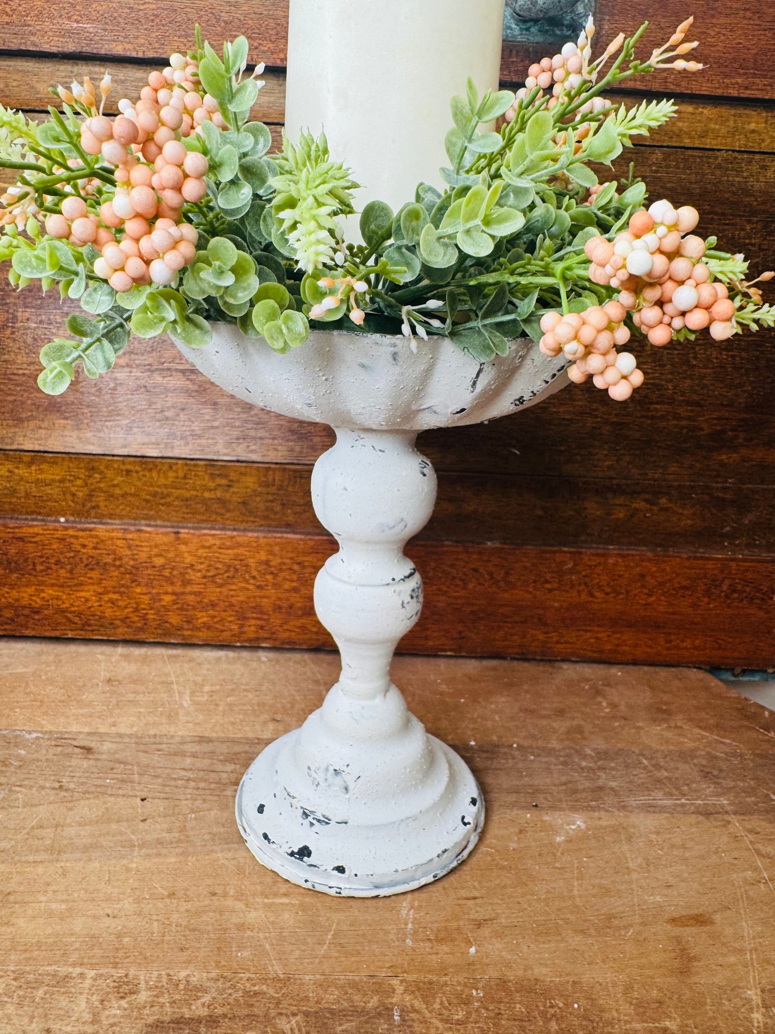 DISTRESSED TALL WHITE FOOTED COMPOTE / CANDLE HOLDER WITH BERRY WREATH RING