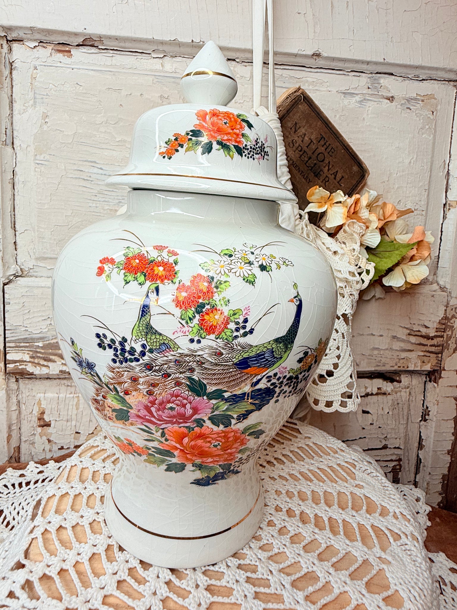 GORGEOUS LARGE ANTIQUE PHEASANT 22k GOLD GINGER JAR- RARE!!