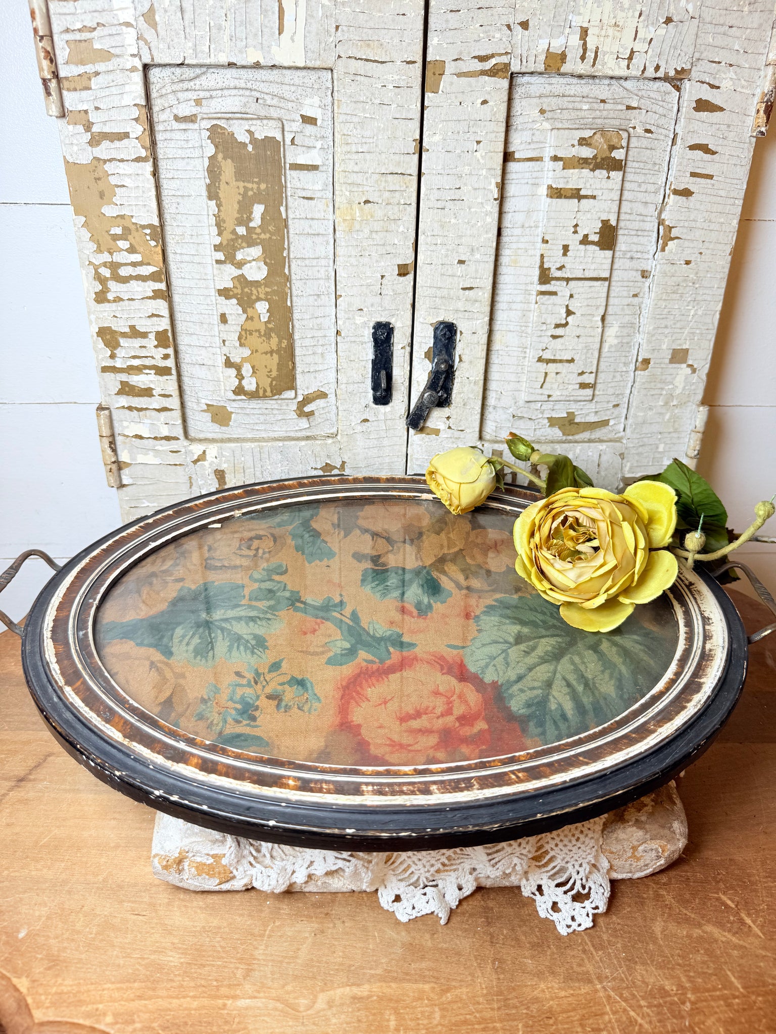 ANTIQUE WOOD TRAY WITH BRASS HANDLES FLORAL - GORGEOUS!!!