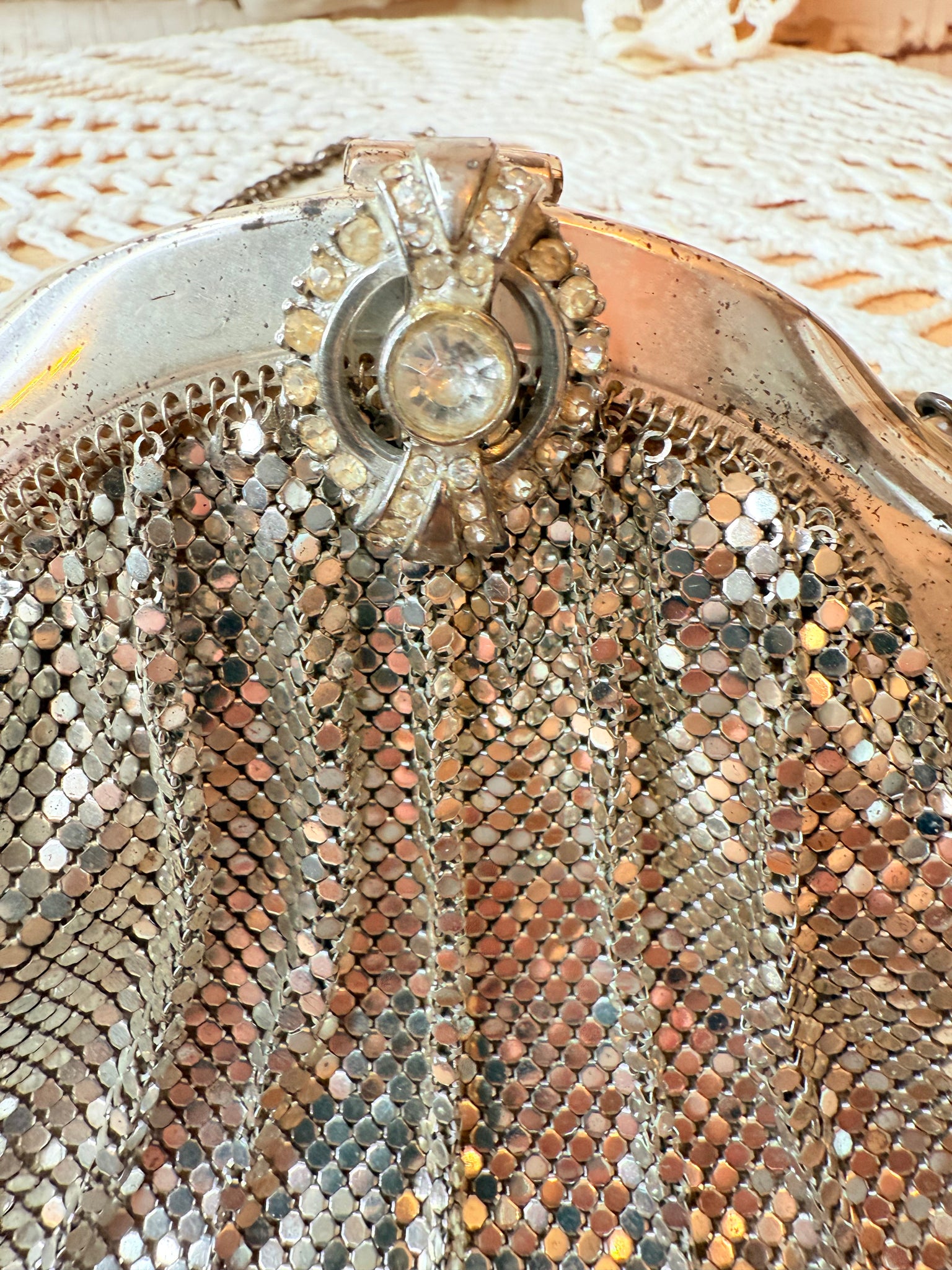 VINTAGE 1950S SILVERY EVENING BAG WITH JEWELED CLOSURE