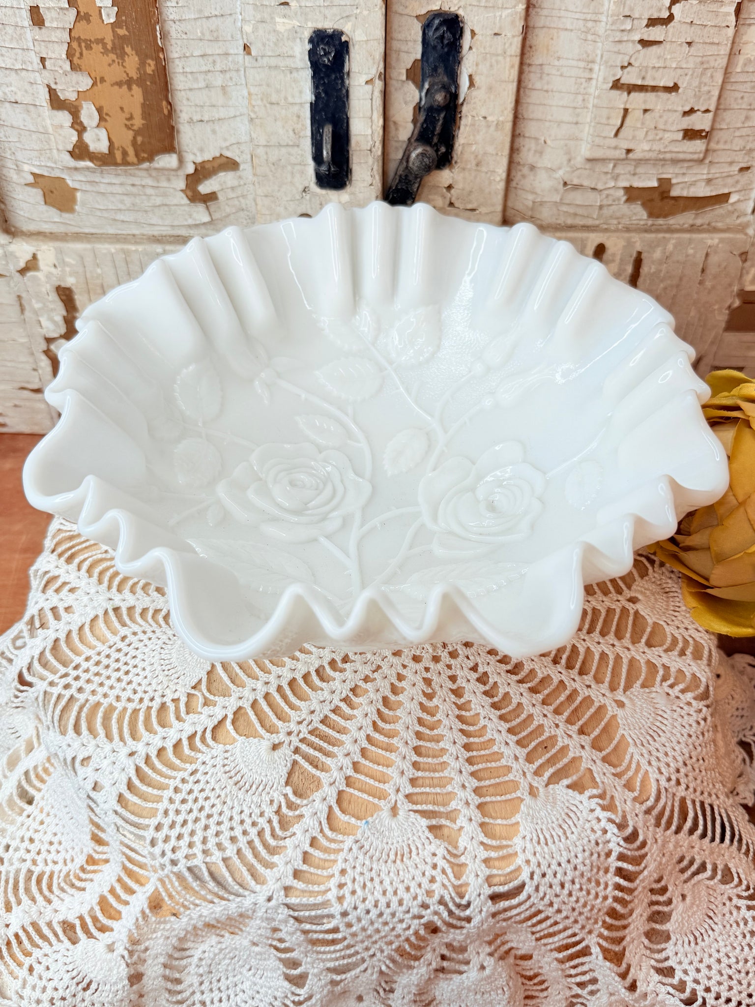 VINTAGE ORNATE RIBBON TRIM MILK GLASS BOWL