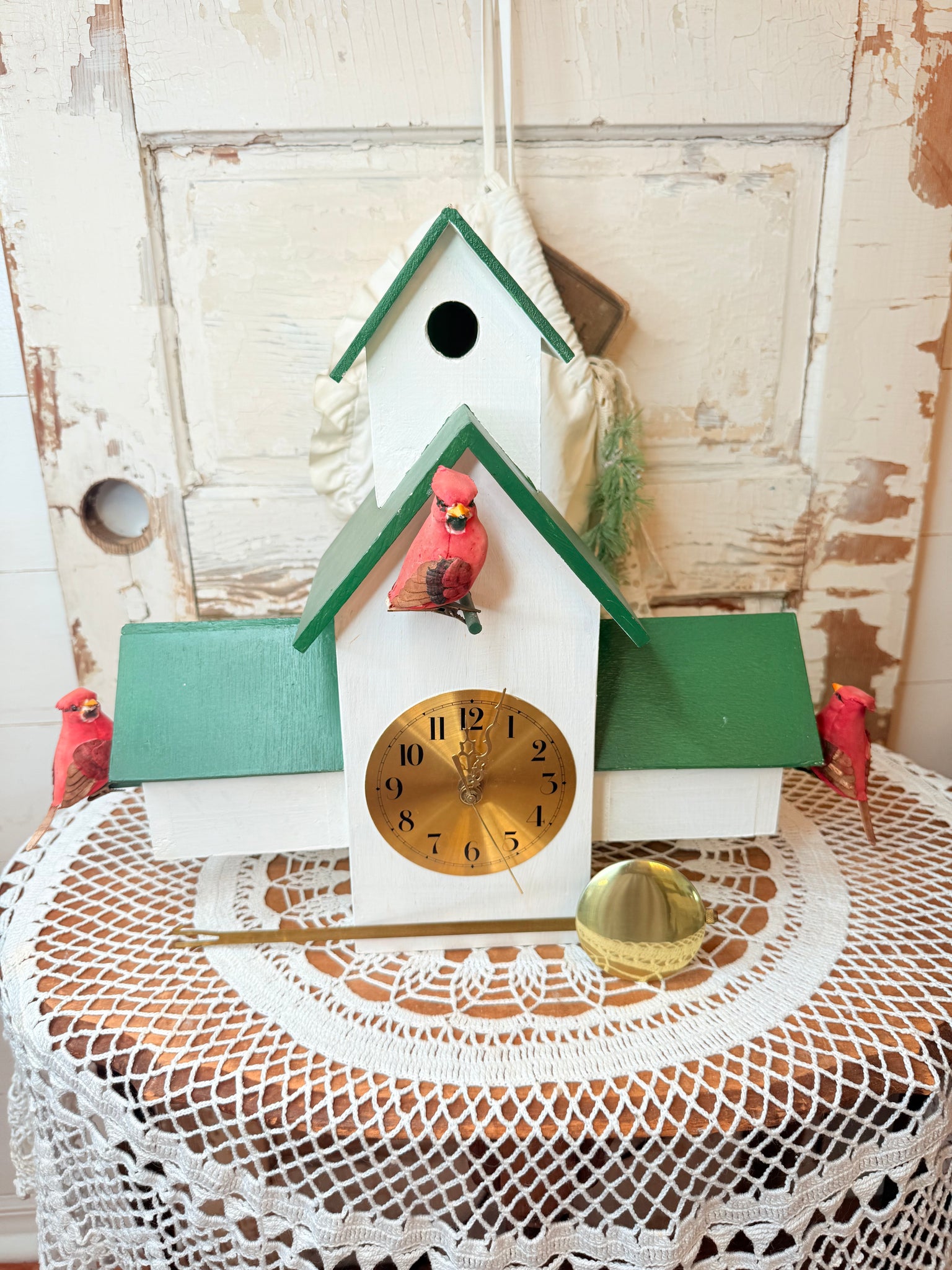WOOD CARDINALS BIRDHOUSE CLOCK